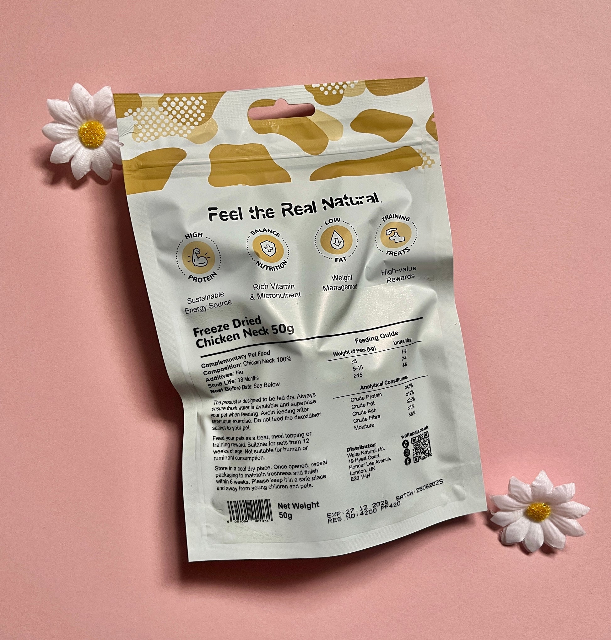 Waita Freeze-Dried Chicken Neck is made from 100% pure, whole chicken necks, gently freeze-dried to preserve their natural nutrients and crunchy texture. A rich source of natural glucosamine, chondroitin, and high-quality protein, this functional chew supports joint health, muscle maintenance, and dental hygiene.